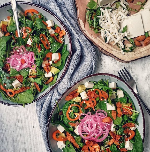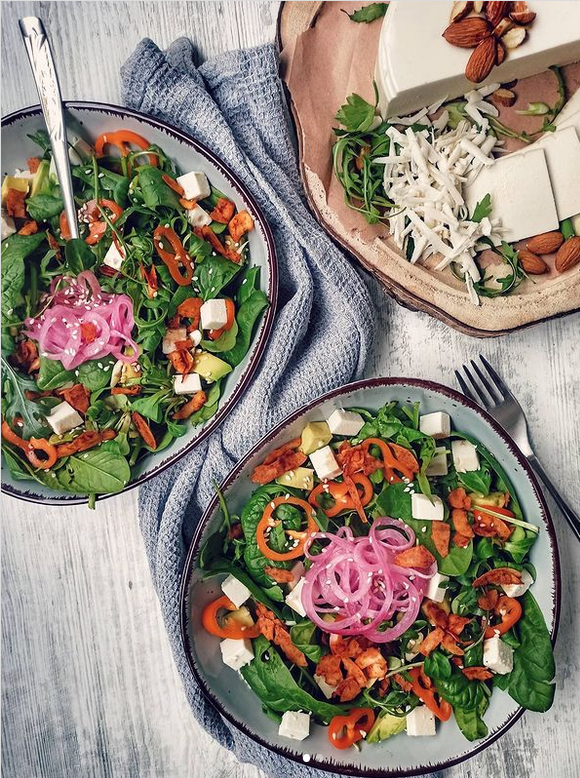Salata sa domaćim tvrdim sirom od badema i veganskom hrskavom slaninom